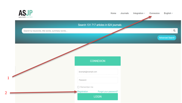 To publish research in the "Journal of Contemporary Business and Economic Studies," authors must create an account on the Algerian Scientific Journals Platform (ASJP). This is a mandatory step for article submission and can be completed by visiting the portal website at https://www.asjp.cerist.dz. Select your preferred language (Arabic, English, or French), then click on “Connexion” at the top. From there, proceed to the "Registration" button, which will open a page where you can fill in the required personal information.